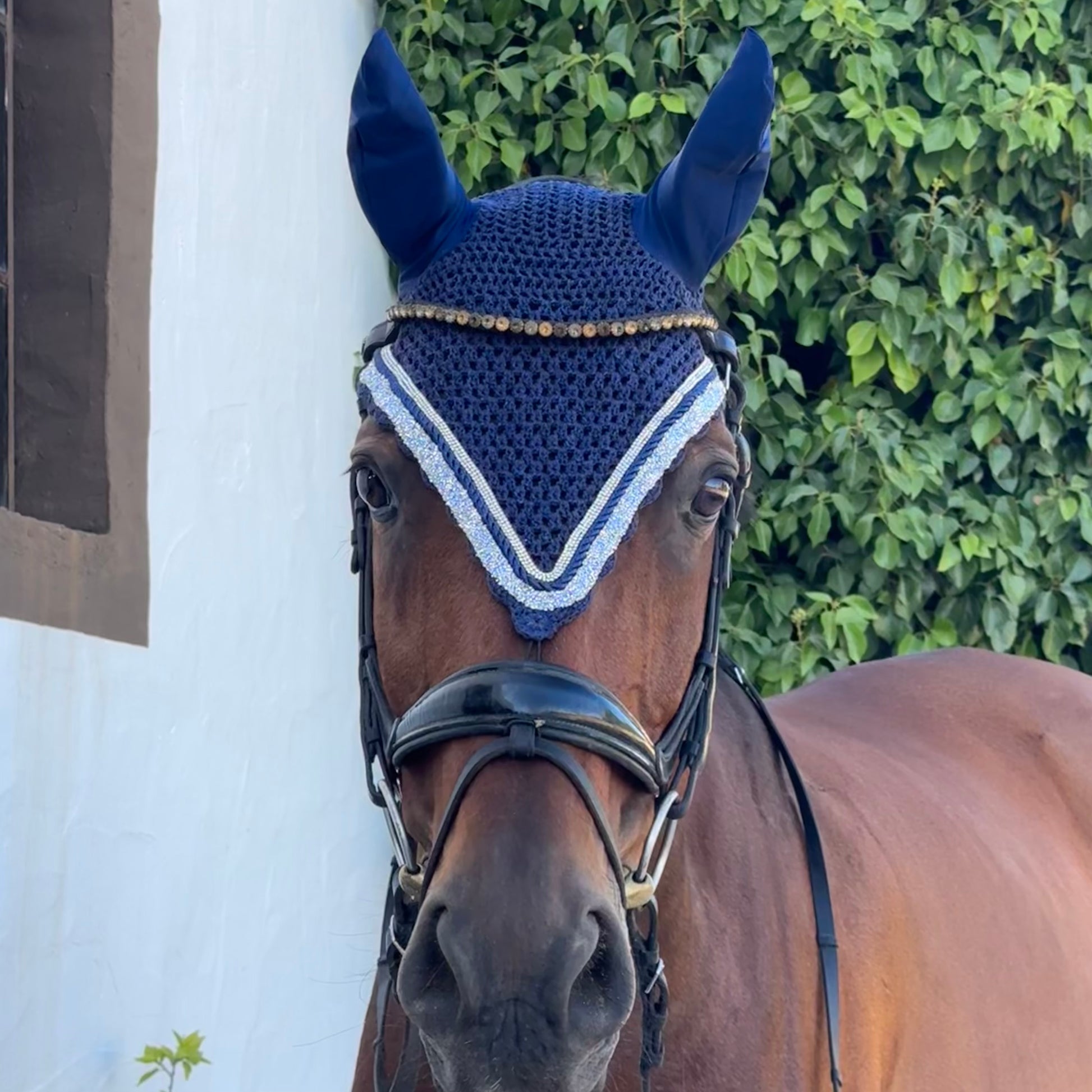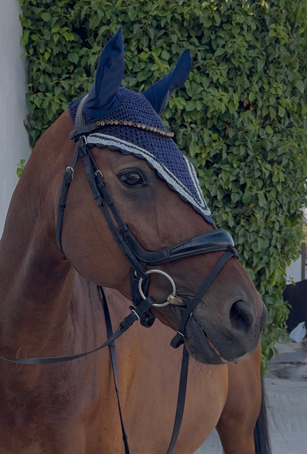 The ONYX bonnet: a navy and silver piece from our design collection “made to order” blending style and comfort for your horse 💙