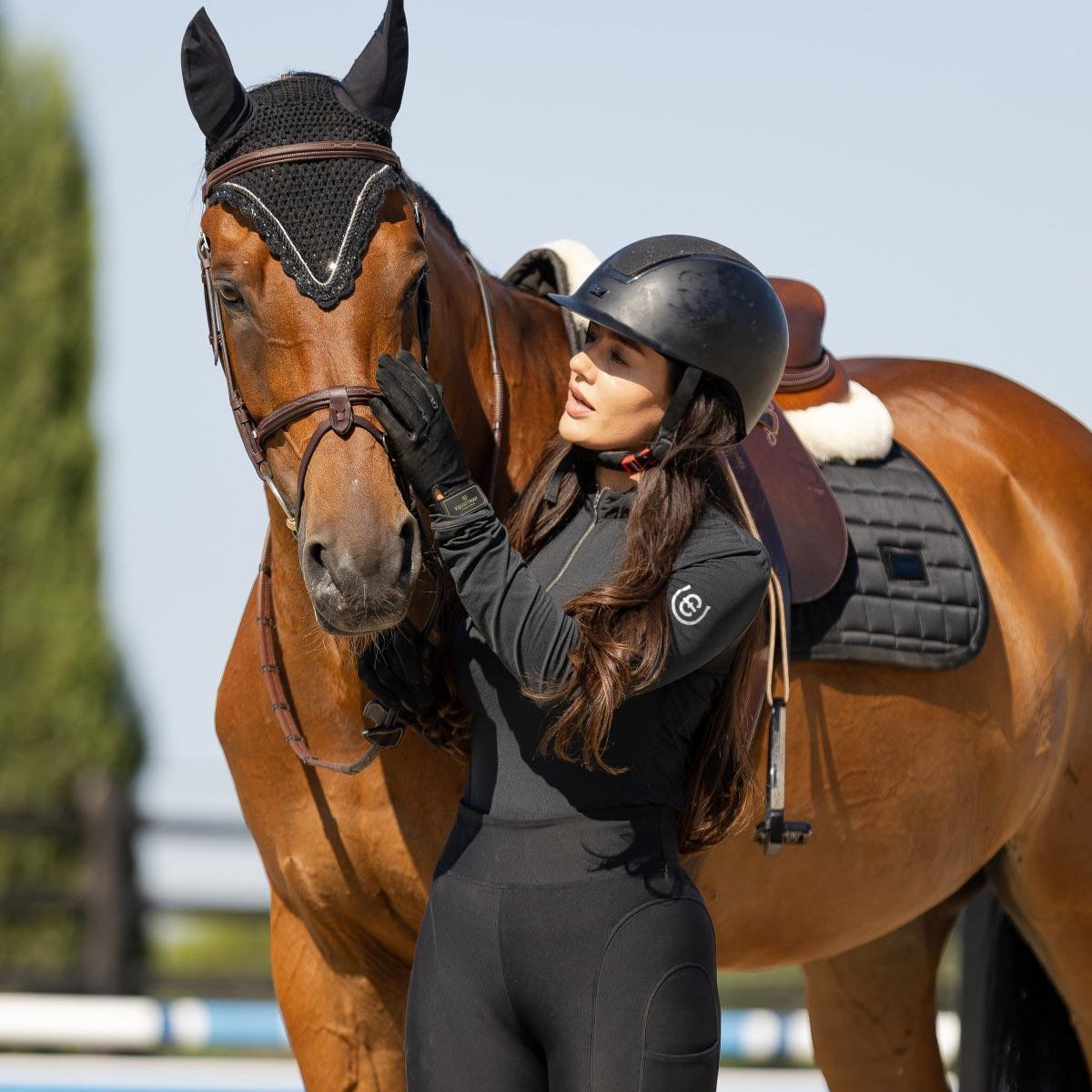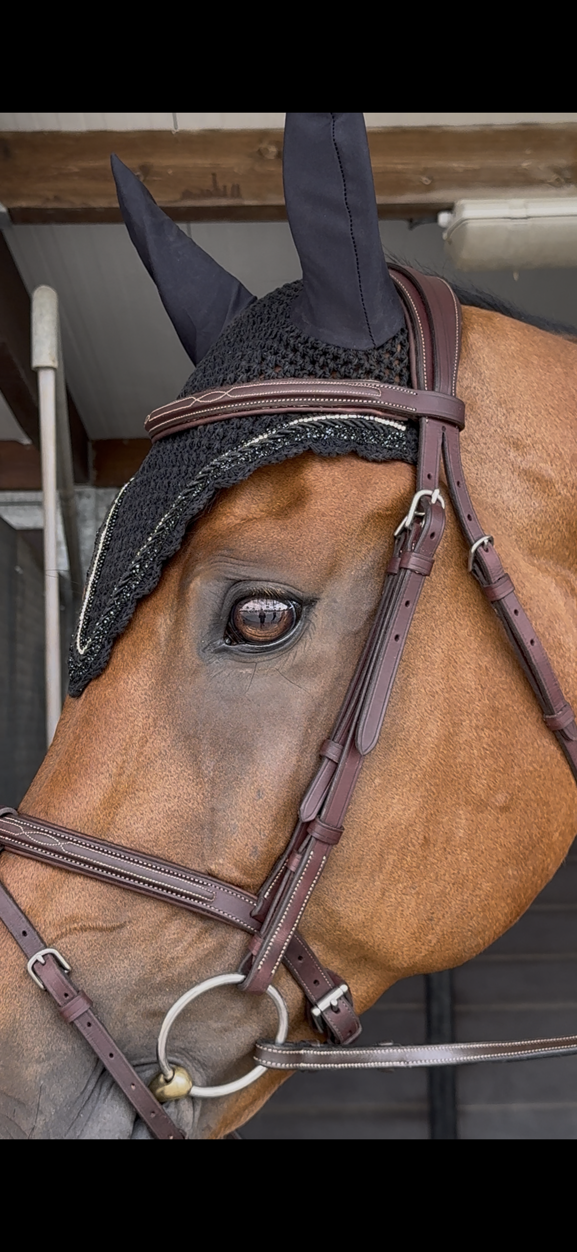 The SILVER SHADOW bonnet: a black and silver piece from our design collection “made to order” blending style and comfort for your horse 🩶